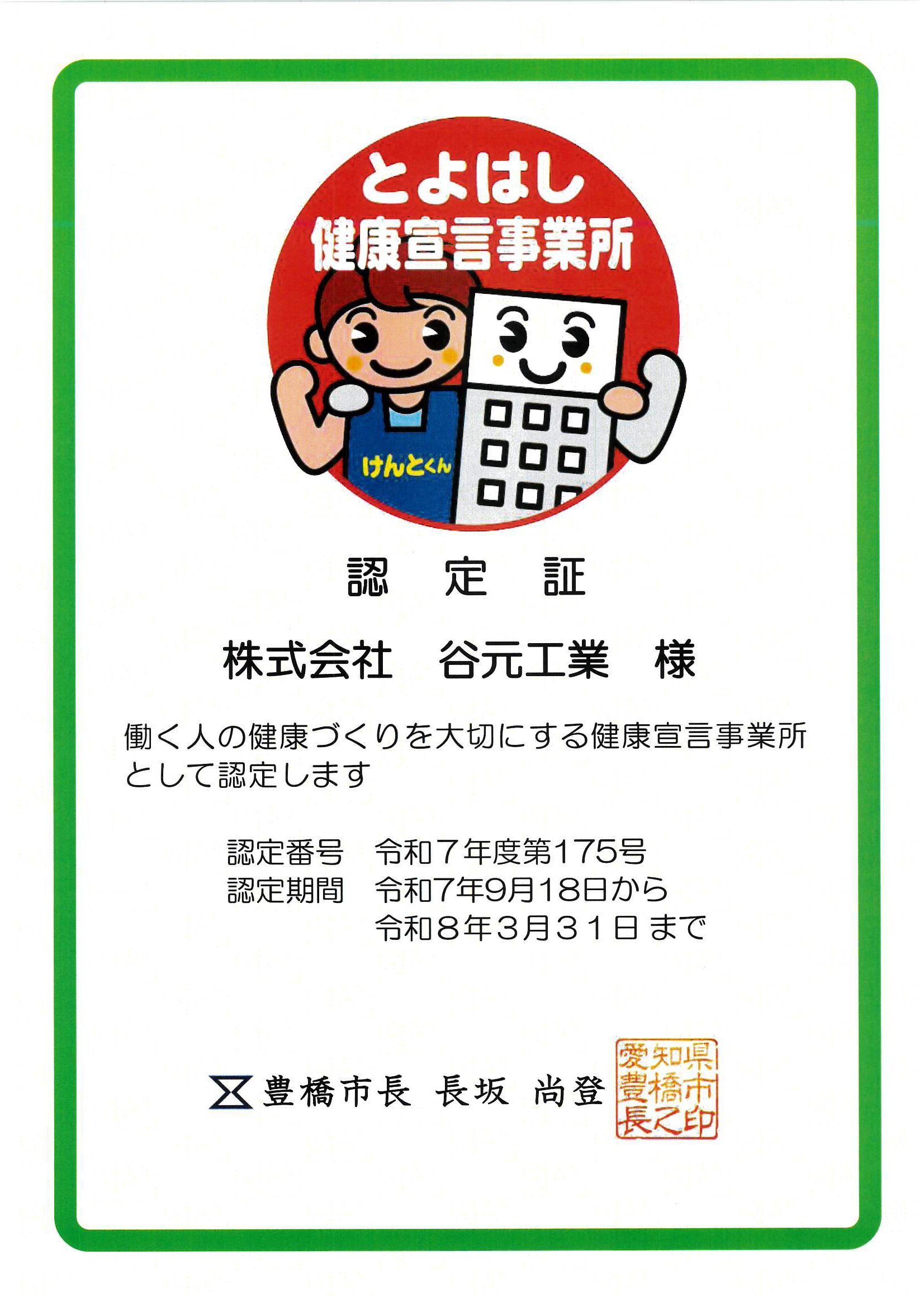 **「とよはし健康宣言事業所認定証」**を取得いたしました。